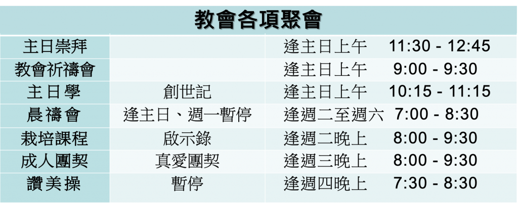 | 教會祈禱會 | 逢主日早上7:00-8:30 | 多方禱告-神國、教會、社會…… |