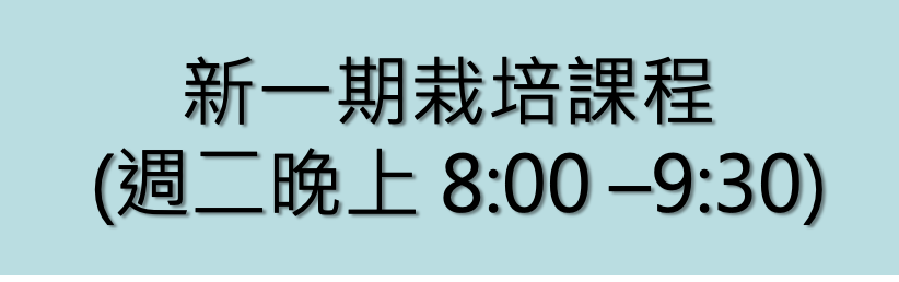 | 栽培課程 | 逢週二晚上8:00~9:30 | 教牧:梁志強牧師/黃鍾素嫺姑娘/黃錦興傳道 |